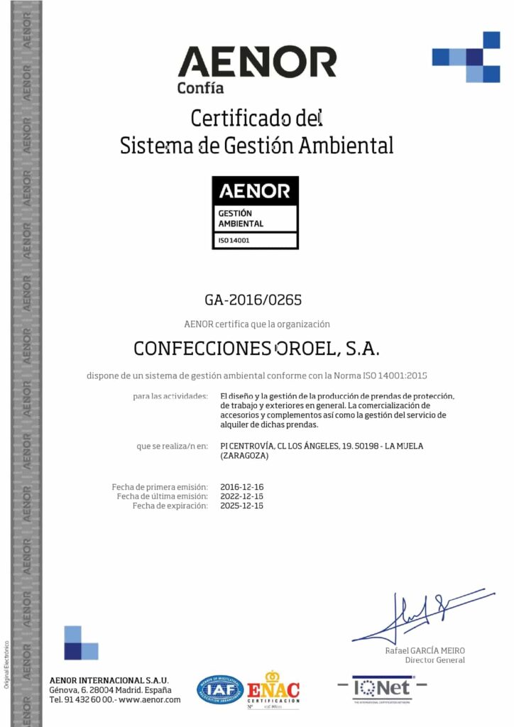 Due to our commitment to the environment, at Confecciones Oroel S.A. we have implemented an environmental management system according to the ISO 14001 standard. This system seeks “Environmental Protection”. This is achieved through a defined strategy of management of environmental risks that may arise from our business activity.