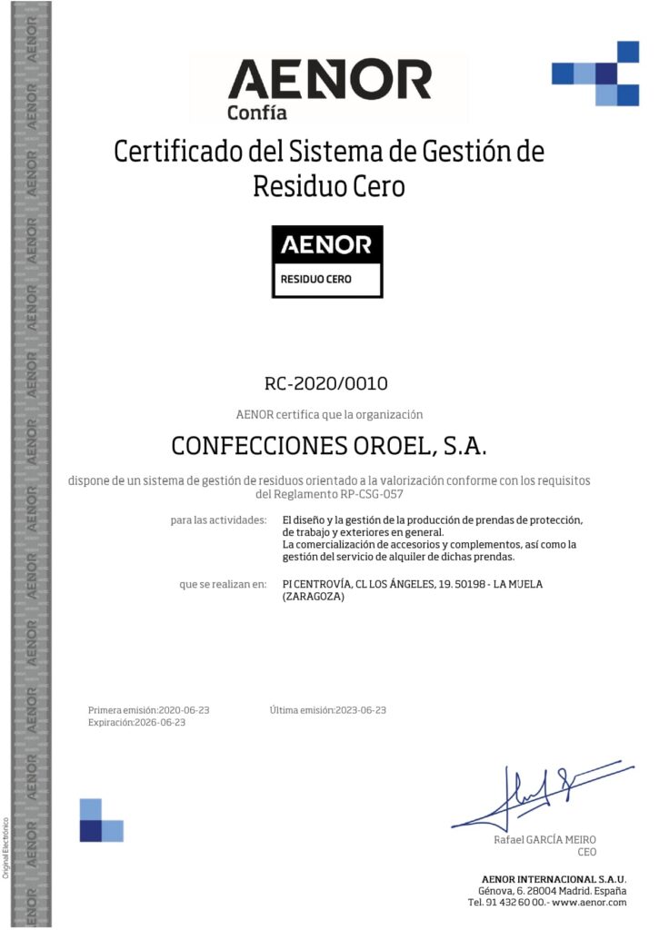 - Maintenance of zero waste certification. According to the verification report issued by AENOR, in 2023, 96.74% of the waste generated at Confecciones Oroel S.A. was destined for recovery