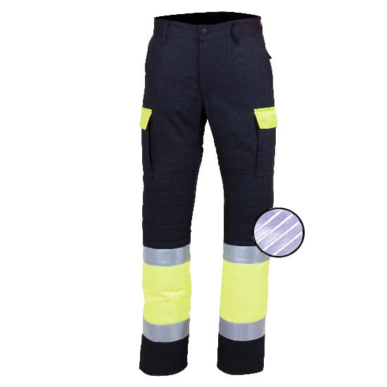 These navy blue and yellow pants are a work safety garment, specifically, a high visibility garment. Thanks to them, the employee can carry out their work comfortably while being protected from various risks arising from poor lighting.