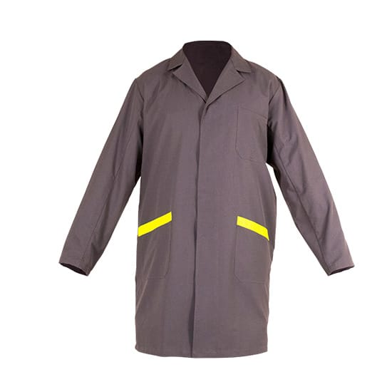 Peignoir fermé en gris avec détail jaune sur les poches.
