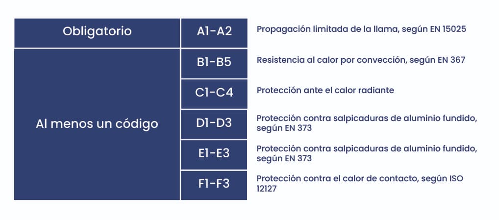 Dentro de esta norma, las prendas se categorizan según su nivel de resistencia a distintos tipos de calor: